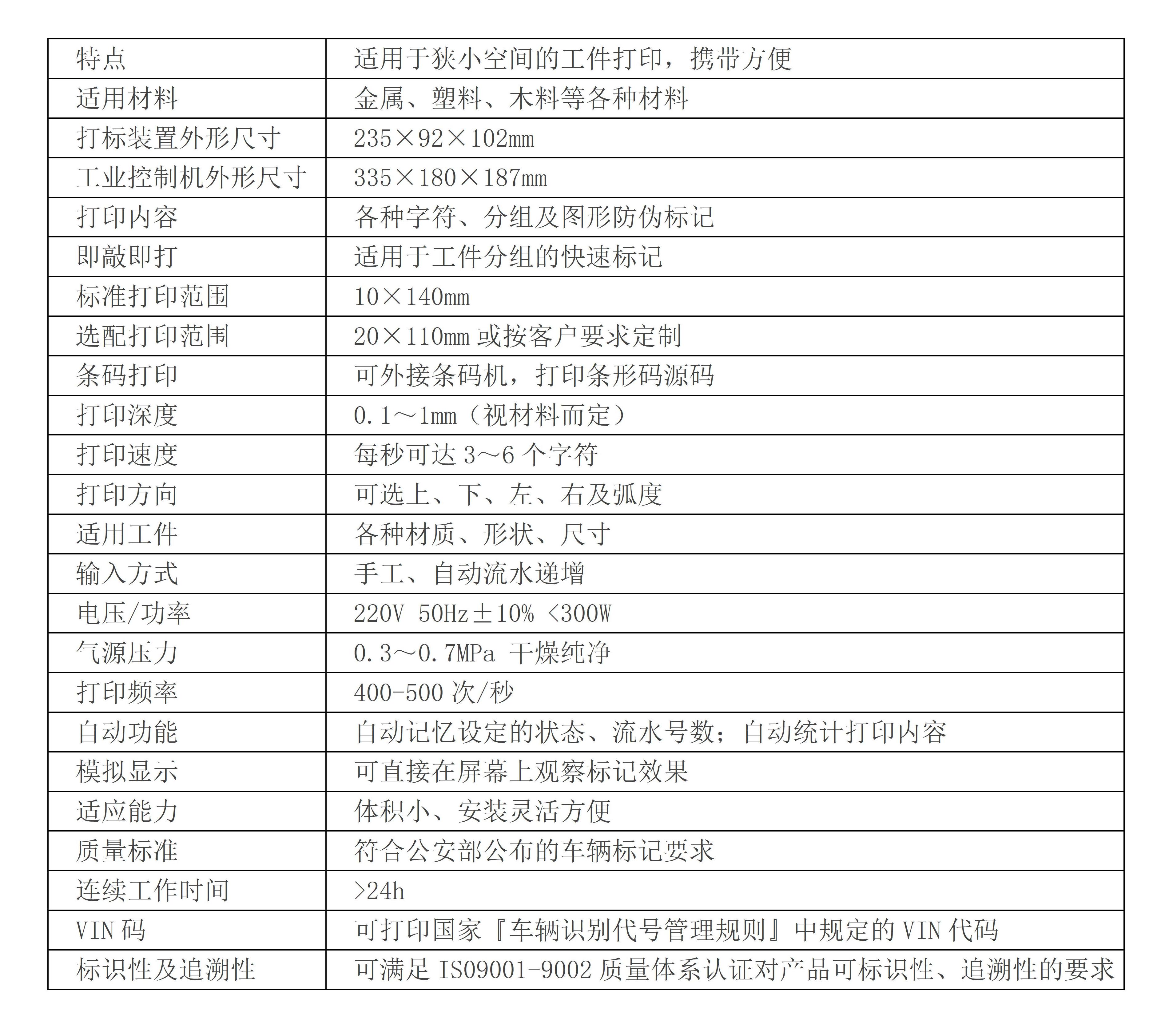 便攜式打標(biāo)機(jī)是把打印機(jī)頭放到工件上去工作,機(jī)頭設(shè)計(jì)輕便,便于攜帶,對(duì)于不易搬動(dòng)的大型工件輕松實(shí)現(xiàn)打標(biāo),適用于車架、發(fā)動(dòng)機(jī)、鋼軌、鋼瓶等大工件的標(biāo)記。